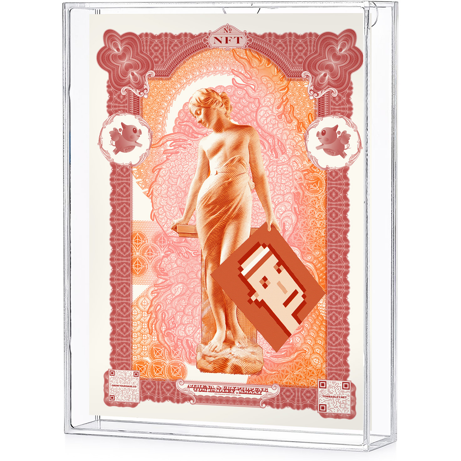 Authenticity has been an eternal problem for art. Verifying an artwork is the deciding factor to determining its cultural significance and financial value. These works, made with Grow Your Base, represent Badley’s first true uncopyable artworks, outside of the familiar territory of the banknote. They realize an long held artistic dream, to extrapolate banknote design into larger-than-life formats, and offer the market something beautiful, unique, and… uncopyable.
